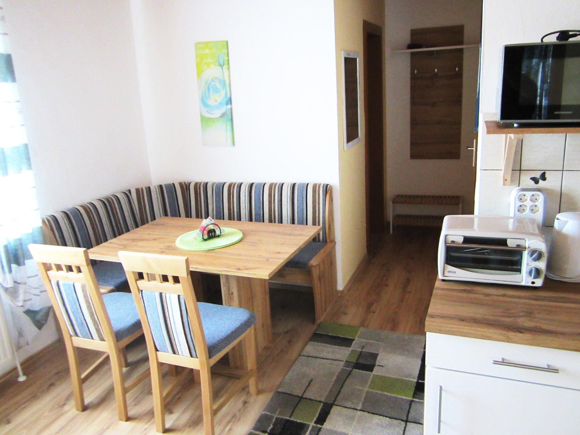В квартире есть полностью оборудованная кухня со всеми необходимыми кухонными принадлежностями (электрическая плита, холодильник, микроволновая печь, духовка, кофеварка, чайник и яйцеварка, тостер, посуда для приготовления и приема пищи) и обеденная зона на 2-4 человек.